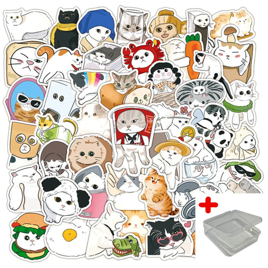 50pcs Cute Cat Stickers for Helmet, Wall, DIY Decoration with Storage Box