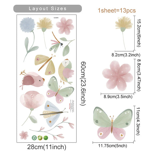 Pink Butterfly Flowers Birds Wall Stickers for Kids Bedroom Nursery Decor