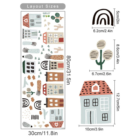 Cartoon City Houses Trees Airplane Watercolor Vinyl Wall Decals Kids Room Decor