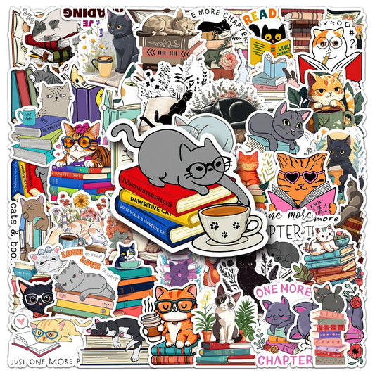 50Pcs Cat Reading Cartoon Waterproof Vinyl Stickers for Skateboard Snowboard