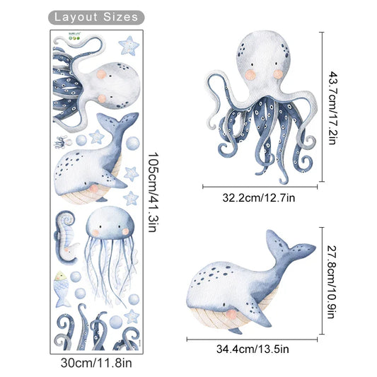 Cartoon Marine Animal Wall Stickers - Octopus & Sharks Decor for Bedroom & Nursery