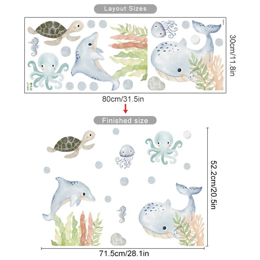 Cute Marine Life Wall Decals: Dolphin, Whale, Seaweed Nursery Stickers for Kids Room Decor