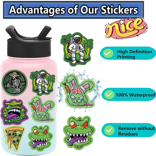 50pcs Green Skull Graffiti Stickers Flower Waterproof DIY For Water Bottle Laptop Phone Skateboard For Adults Teens Sticker