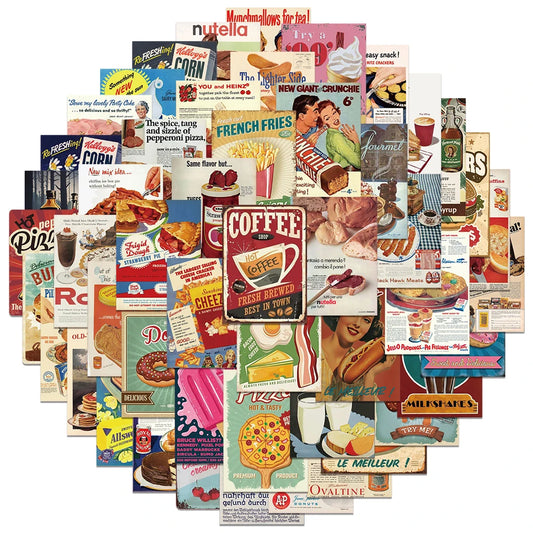 50pcs Retro Food Graffiti Stickers for Helmets, Walls, DIY Decor