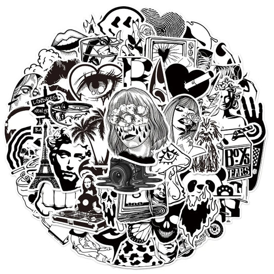 50pcs Graffiti Black and White Art Styling Stickers Laptop Luggage Phone Case Guitar Fridge Car Motorcycle Cool Ins Decals