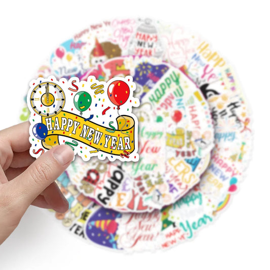 50PCS Cute Happy New Year Stickers DIY Scrapbook Diary Stationery Luggage Decorative Cartoon Sticker Kids Toys