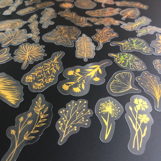 80 Glitter Gold Waterproof Plant Flower Stickers, Transparent PET Adhesive Decals
