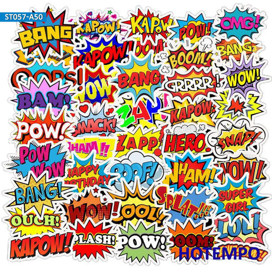 50pcs BAM POW WOW BOOM BANG OMG OOP Explosion Cloud Style Anime Slogan Stickers Pack for Phone Laptop Luggage Skateboard Sticker