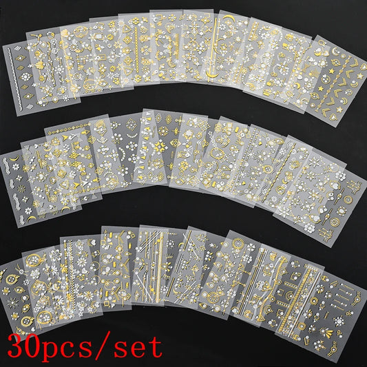30pcs Lace Nail Stickers: Black & White Floral Star Designs