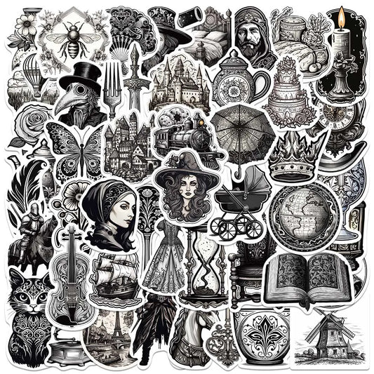 50PCS Vintage Medieval Black White Stickers Aesthetic Diary Scrapbook Laptop Phone Bottle