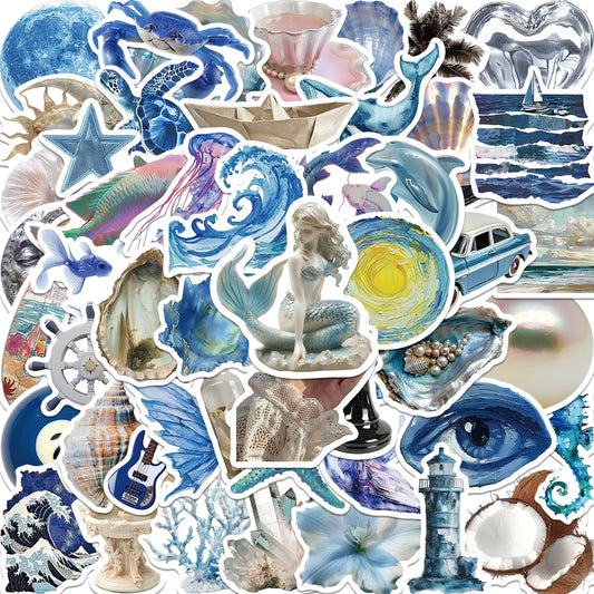 50pcs Vintage Blue Marine 3D Aesthetic Vinyl Stickers for DIY, Journal, Guitar, Motorcycle, Computer