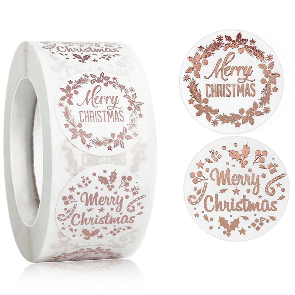 1" Merry Christmas Rose Gold Waterproof Stickers - 100-500 Pcs Holiday Gift Seals