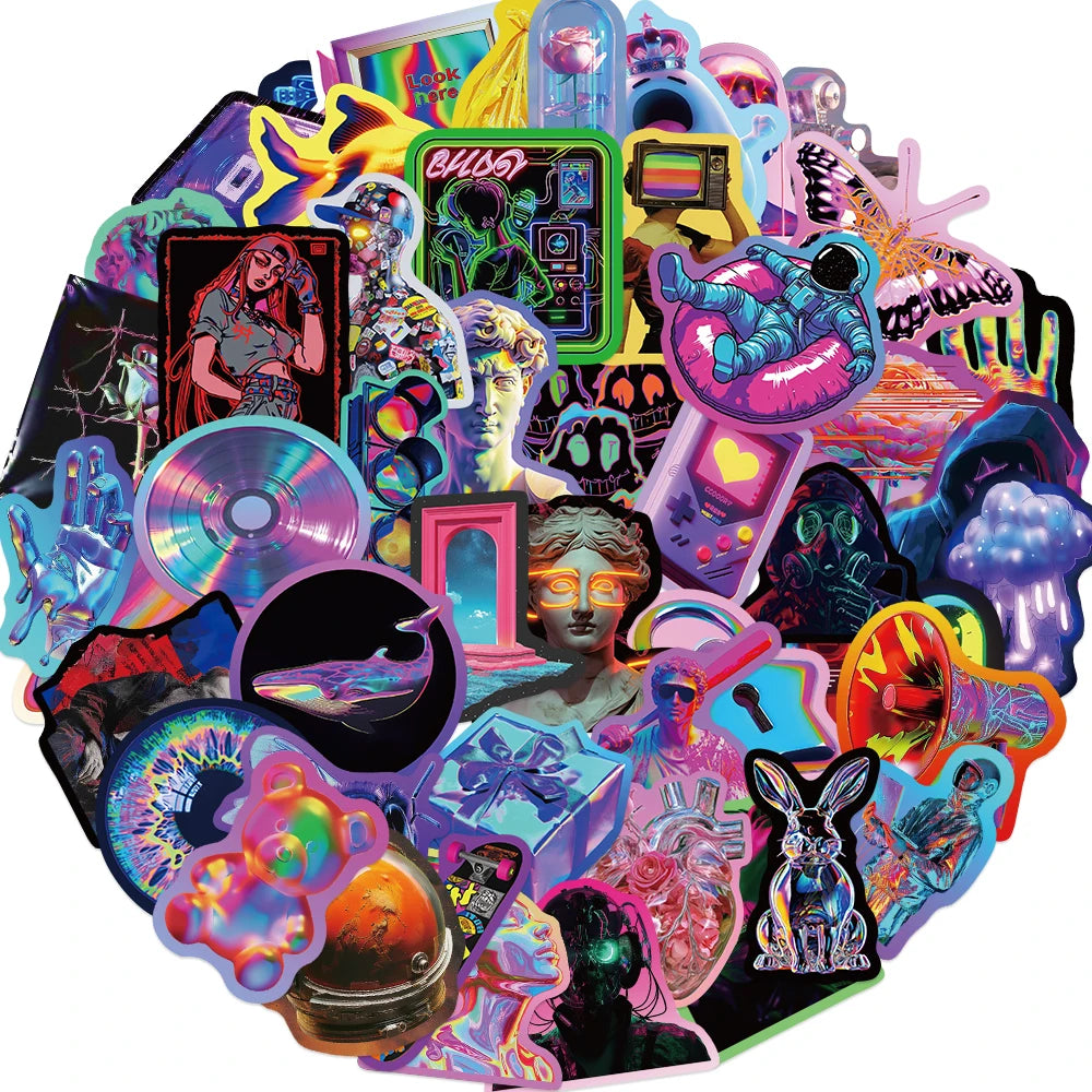 Crafted with high-quality, waterproof materials, these stickers are designed to withstand the elements, making them ideal for both indoor and outdoor use. Each sticker features a unique design, ranging from neon cityscapes and robotic characters to glitch art and holographic effects. They are perfect for personalizing your suitcase, phone, skateboard, laptop, luggage, fridge, car, and more.