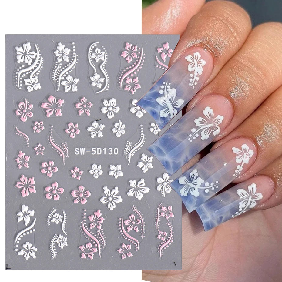 5D Hibiscus Flower Nail Embossed Sticker Acrylic White Pink Petal Leaf Adhesive Decal Butterfly Dragon Floral Elegant Decor Foil