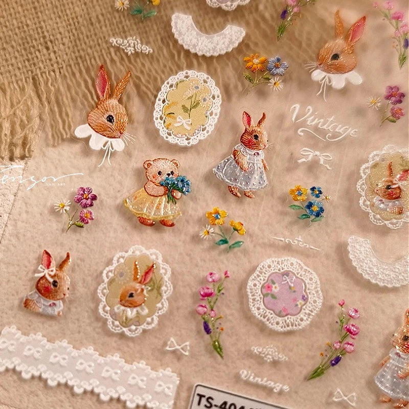 Retro Bunny Bear Nail Art Stickers - Floral Lace Decals